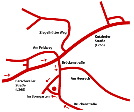 - In einer sehr scharfen Rechtskurve geht links eine kleine Gasse ohne Straßenschild ab – hier sind Sie richtig! (unser Vorschlag an die Gemeinde Heusweiler: „Lindner-Dorschel Allee“ – gar nicht protzig, oder?) In dieses Sträßchen fahren Sie einfach rein und Sie sind schon fast am Ziel: